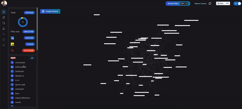 Skott is a minimalist developer tool that can be used to efficiently generate directed graphs from your JavaScript/TypeScript/Node.js project. It can automatically collect metadata such as file size, third-party or builtin dependencies, detect circular dependencies, finding unused npm dependencies, help you building tools relying on graph data structures thanks to the exposed primitives.